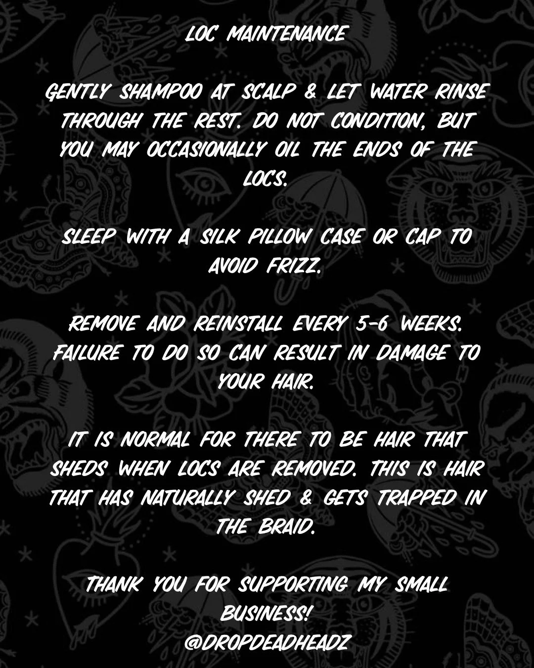 I will only guarantee my work if you follow the at home care guide provided after your service and use the recommended products. Please review the at home care guides below for extensions, loc maintenance, and color treated hair.